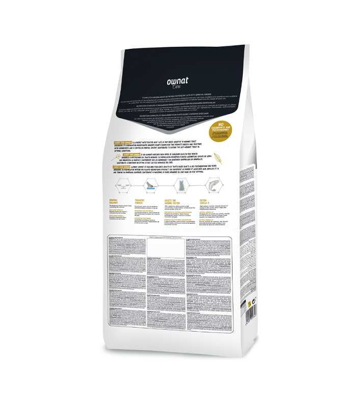 OWNAT CARE URINARY es un alimento indicado para gatos de cualquier raza en fase adulta sensibles a afectaciones del tracto urinario. Su formulación incorpora plantas aromáticas (diente de león) que favorecen la diuresis y, juntamente con los arándanos y un contenido controlado de minerales, contribuye a mantener en óptimo estado las vías urinarias del gato.