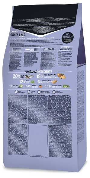 Pescado 37% (Pescado fresco* min 20% antes de extrusión, salmón hidrolizado 10%, pescado deshidratado 7%), carne deshidratada (21%), guisantes enteros*, raíces de mandioca*, grasa avícola (preservada con antioxidantes naturales), patata deshidratada*, levadura de cerveza*, proteína hidrolizada de pollo, pulpa de remolacha, manzana fresca* (1%), aceite de pescado (preservado con antioxidantes naturales), sal gema*, alfalfa deshidratada*, fructo y manano oligosacáridos, algas marinas deshidratadas*, glucosamina, condroitina, yucca schidigera, arándanos*, tomillo*, flor de manzanilla*, hinojo*, equinácea*, té verde*. *Ingredientes naturales.