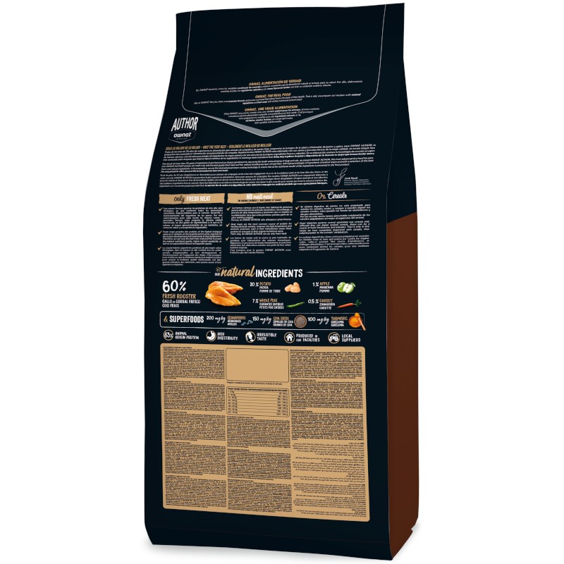COMPOSICIÓN: Gallo de corral fresco* (60 % mín. antes de la extrusión), patata deshidratada*