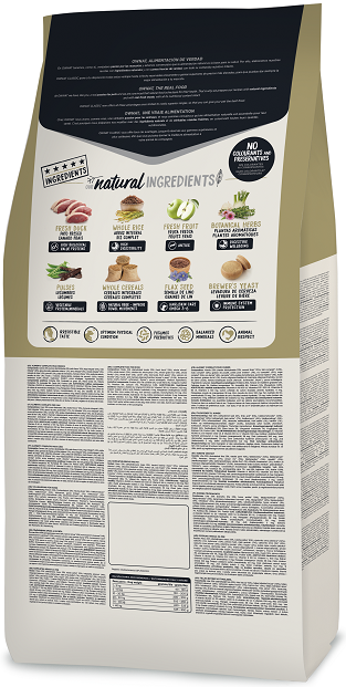COMPOSICIÓN: Carnes 33% (carnes deshidratadas 23%, pato fresco* 10% antes de la extrusión), trigo integral* (14%), maíz integral* (12%), grasa de pollo, guisantes enteros* (7%), arroz integral* (5%), cebada integral* (5%), salvado de trigo* (5%), garrofa* (2%), pulpa de remolacha, manzana* (1%), aceite de salmón, semilla de lino* (1%), fructo y manano oligosacáridos, levadura de cerveza* (0,5%), plantas aromáticas 0,02% (hinojo*, equinácea*, tomillo*), yucca schidigera. *INGREDIENTES NATURALES