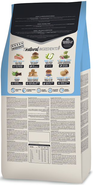 Carnes 39% (carnes deshidratadas 29%, pollo fresco* 10%), arroz integral* (12%), trigo integral* (9%), grasa de pollo, maíz integral* (8%), salvado de trigo* (8%), cebada integral* (7%), guisantes enteros* (2%), manzana fresca* (1%), aceite de salmón, semilla de lino* (1%), pulpa de remolacha, fructo y manano oligosacáridos, levadura de cerveza* (0,5%), hierbas botánicas 0,02% (hinojo*, equinácea*, tomillo*), yucca schidigera. *Ingredientes naturales.