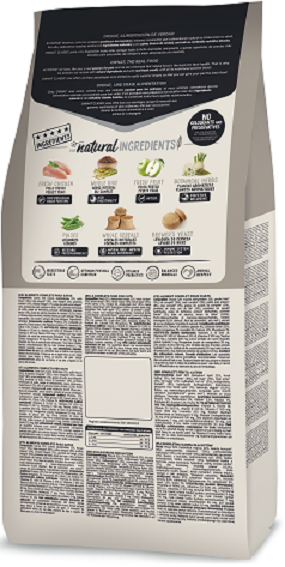 Carnes 32% (carnes deshidratadas 22%, pollo fresco* 10%), trigo integral* (19%), maíz integral* (9%), guisantes enteros* (8%), cebada integral* (7%), grasa de pollo, arroz integral* (5%), proteína de maíz, salvado de trigo* (4%), proteína hidrolizada de pollo, pulpa de remolacha, pescado deshidratado, manzana fresca* (1%), aceite de salmón, levadura de cerveza* (0,5%), fructo y manano oligosacáridos, hierbas botánicas 0,02% (hinojo*, flor de manzanilla*, anís verde*), yucca schidigera. *Ingredientes naturales