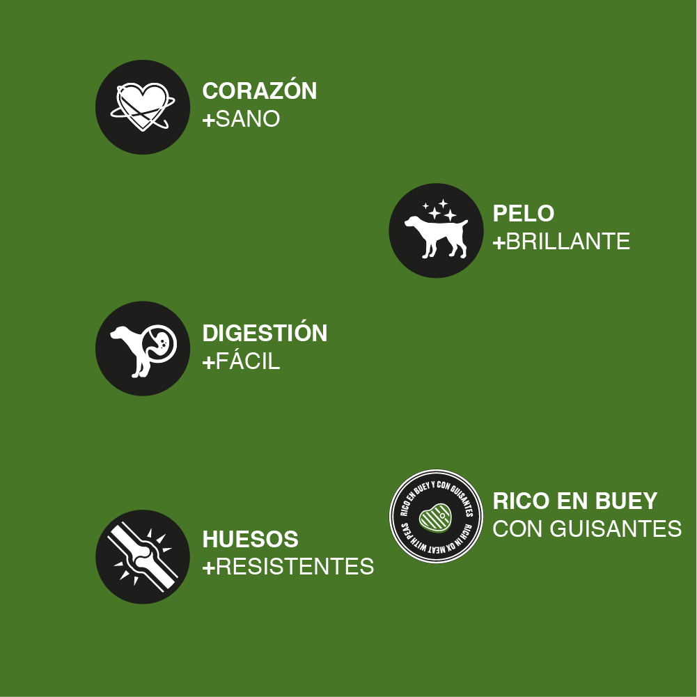 Carne y derivados animales (buey mín. 20%), cereales, derivados de origen vegetal, legumbres (guisante mín. 4%), aceites y grasas, sustancias minerales.