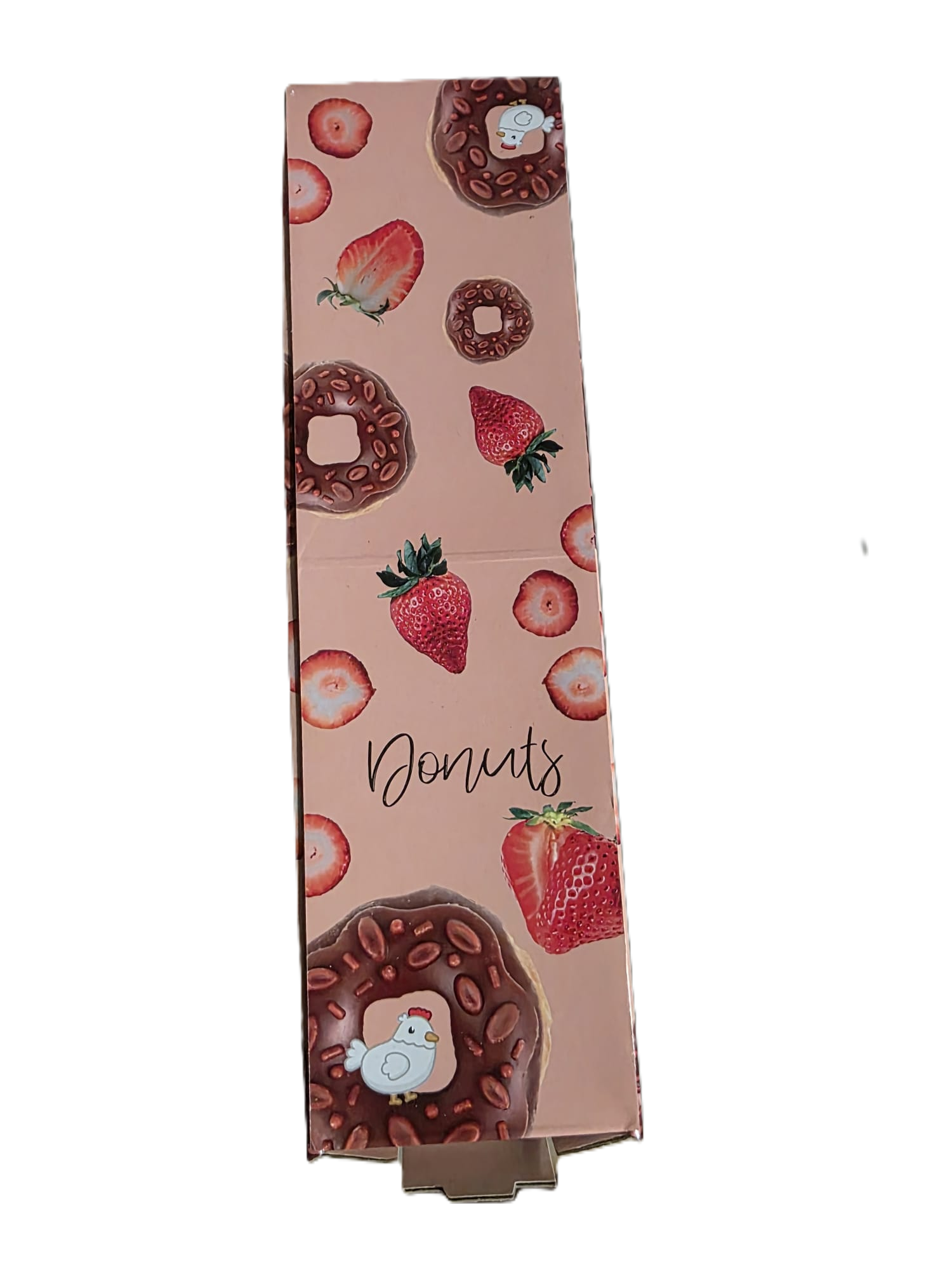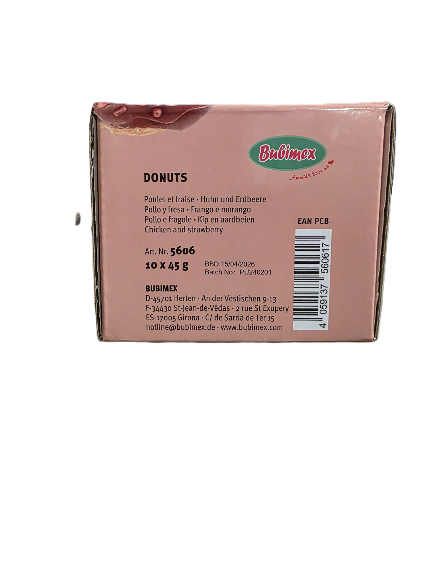 Donuts de 45 gramos con los ingredientes pollo y fresa.